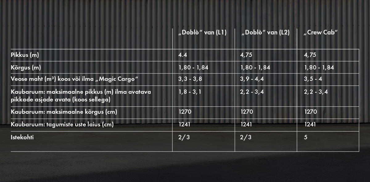 Tänu hõlpsalt ümberkorraldatavale kaubaruumile on uues Doblòs võimalik vedada kuni 3,44 m pikkust ja kuni 1000 kg kaaluvat veost. Lisaks sellele on ees kolm mugavat istet, mida saab igapäevaste vajaduste järgi muuta ning kasutada lõunapausil lauana või töö ajal mobiilse kontorina.
