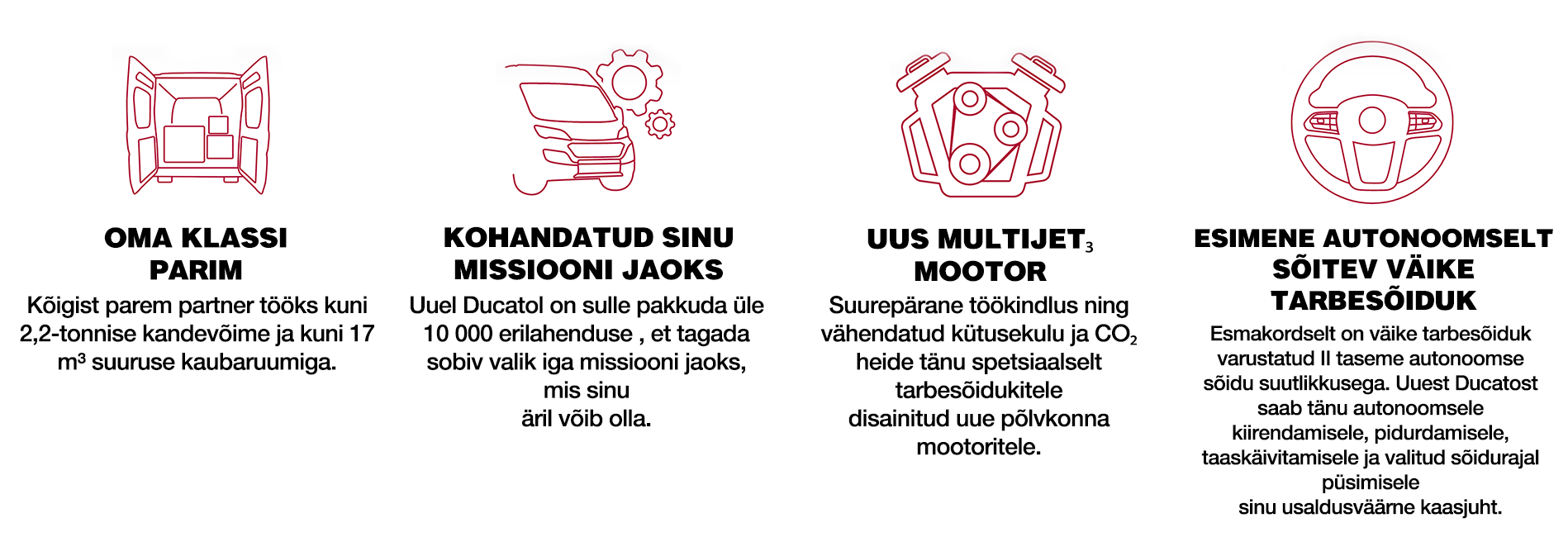 Tänu täielikult uuendatud elektrisüsteemile ja roolivõimendile on uue Ducato keskmes uuenduslikud ohutus- ja turvafunktsioonid, mis tagavad sulle ohutuma töökoha ja stressivaba sõidukogemuse. II taseme autonoomia ülendab Ducato ühe juhiga süsteemist arvukate täiustatud juhiabisüsteemidega (ADAS) sõidukiks, mis suudab võtta üle roolimise, kiirendamise ja pidurdamise erinevate stsenaariumite korral.